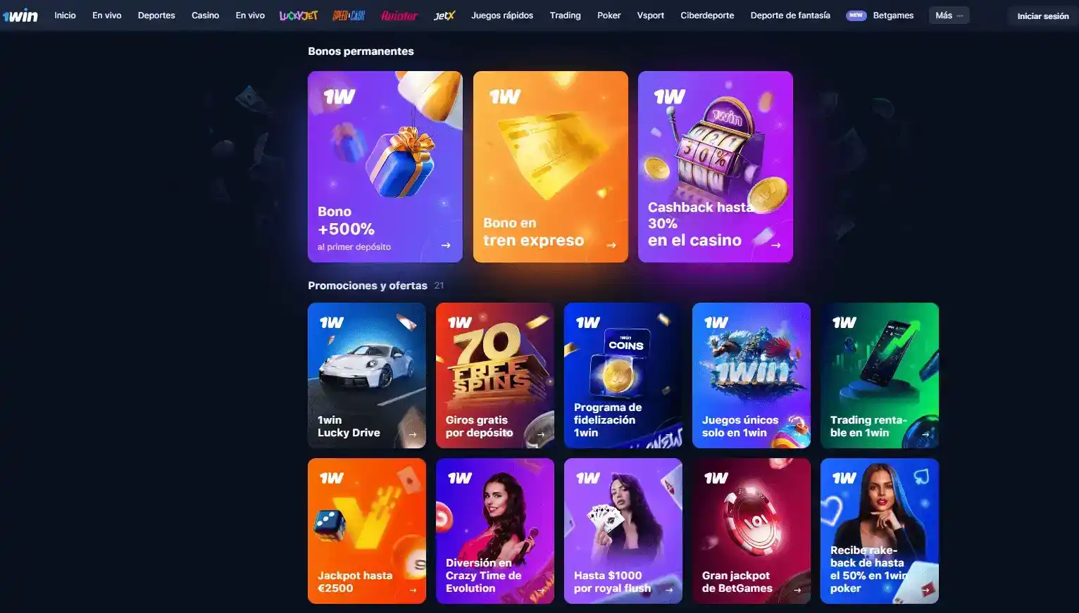 | Bono de bienvenida | 500 % sobre el primer depósito (hasta un momento específico por 1 Win) |